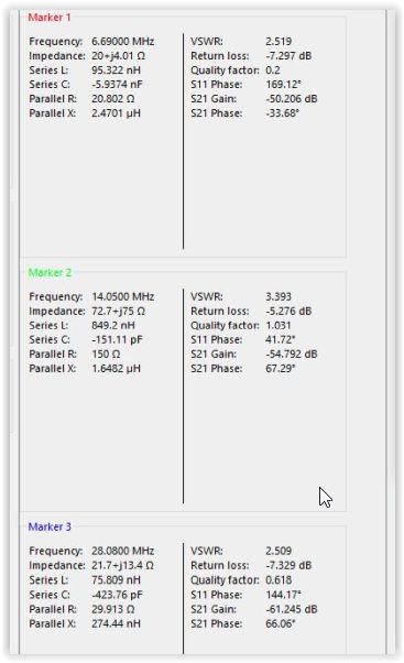 Óh, sorry, most veszem észre, hogy a két mérésnél felcseréltem az SWR és az Imag Z színét és a markereknél a sorrendjét. Nem akarok új mérést csinálni, nézzétek el a szépséghibát. Ezen értékek eredménye az impedancia ( Z fekete ) értéke sem sokkal különbözik, 28,07 és 37,35 Ohm. Ideális esetben 50 Ohmnak kellene lenni, 0-hoz közeli reaktáns összetevőkkel.